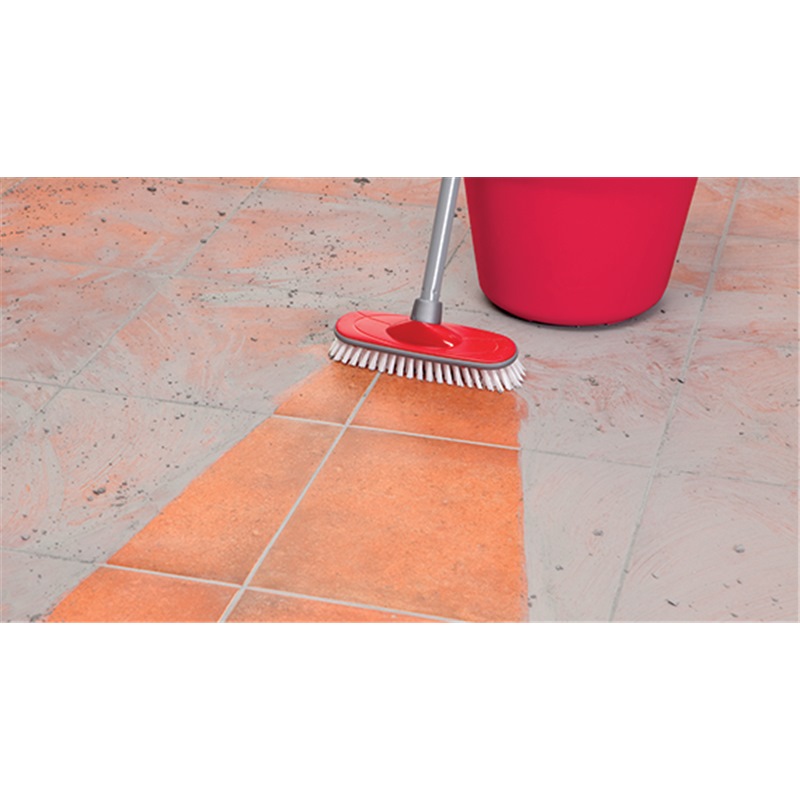 Scrub the surface well with a stiff broom or scrubbing brush. Leave it to work for a few minutes and scrub well once more.