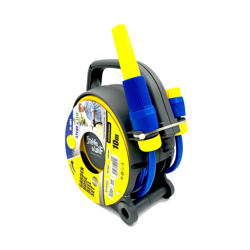 Steve & Leif Garden Hose Reel Set includes a spray nozzle, 10m lightweight garden hose, hose reel cart, and a 3/8" (9.5mm) Tap Adaptor. tap adaptor. Shock-proof and weather resistant. Keeps hose neat and organized. Ready for immediate use wherever it is needed.