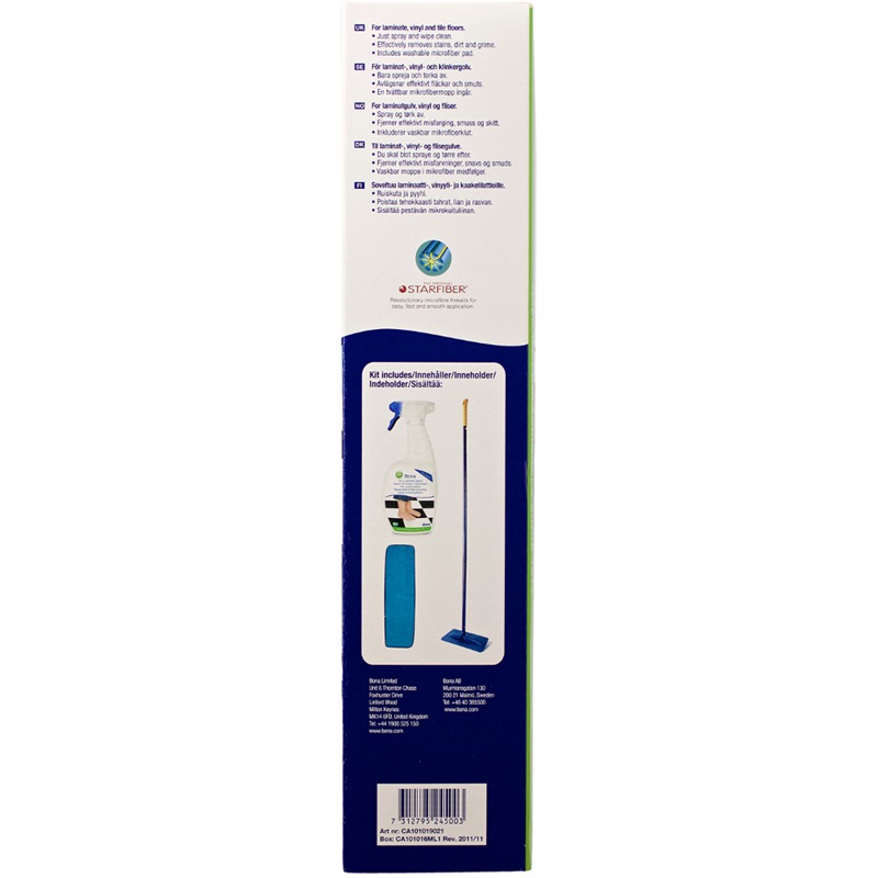 Bona Tile and Laminate Cleaning Kit is a boxed starter kit comprising one Bona four piece mop with handle, one washable microfiber Bona Cleaning Pad and one 1-litre spray bottle of Bona Tile and Laminate Cleaner.