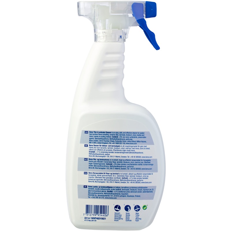 Bona Stone, Tile and Laminate Cleaner is a ready-to-use pH-neutral detergent specifically formulated for cleaning laminate, vinyl, and tile floors.