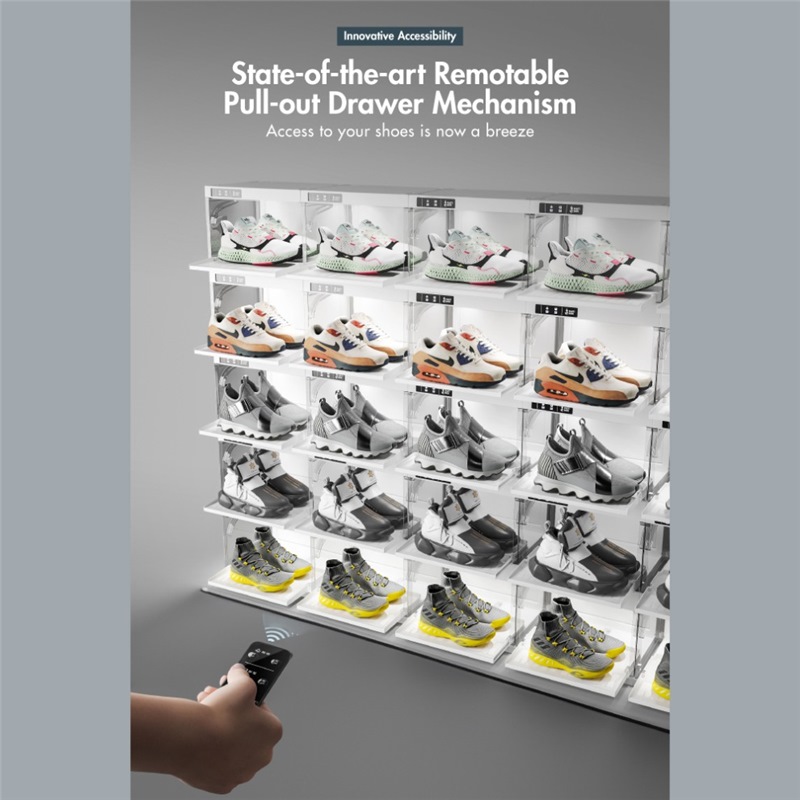 Remote-Lit shoe display transparent stackable box connects multiple shoeboxes automatically once they're placed on top of each other