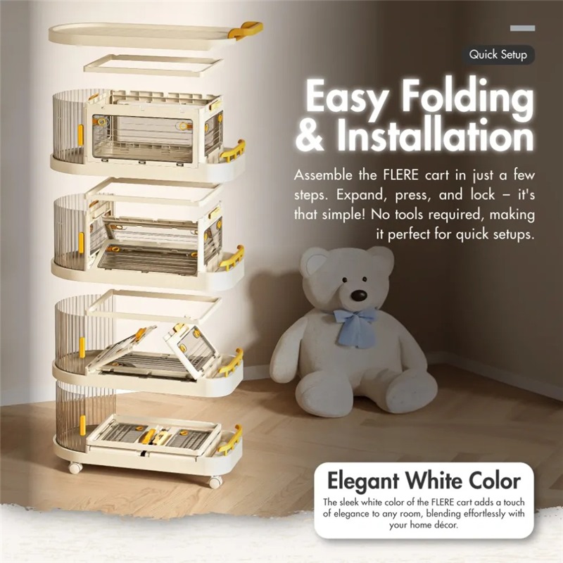 The FLERE storage cart glides smoothly in any direction with its silent 360-degree rollers. Perfect for moving around the house without disturbing others.
