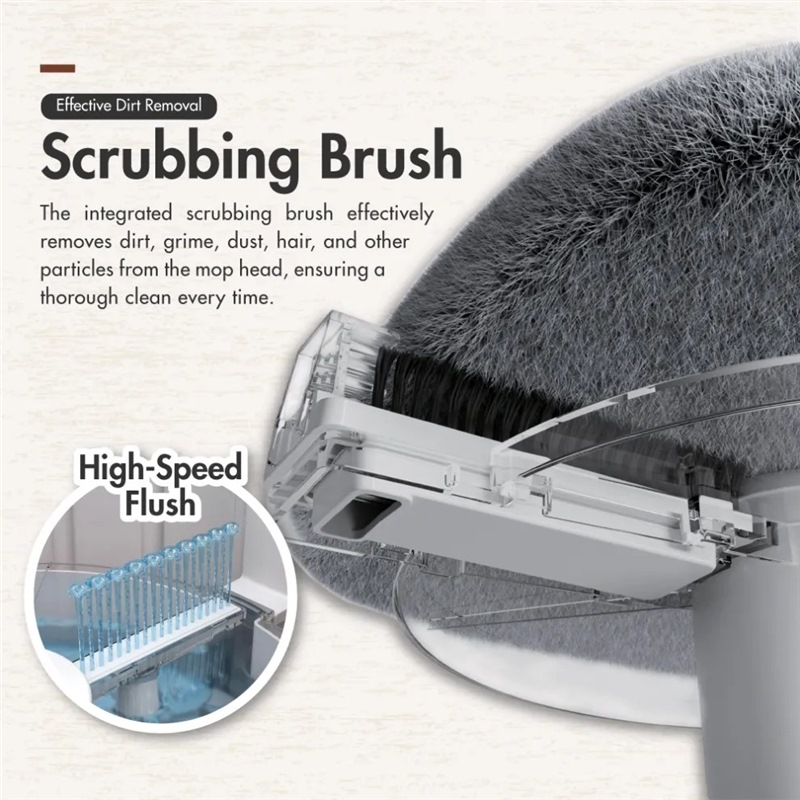 The integrated scrubbing brush effectively removes dirt, grime, dust, hair, and other particles from the mop head, ensuring a thorough clean every time.