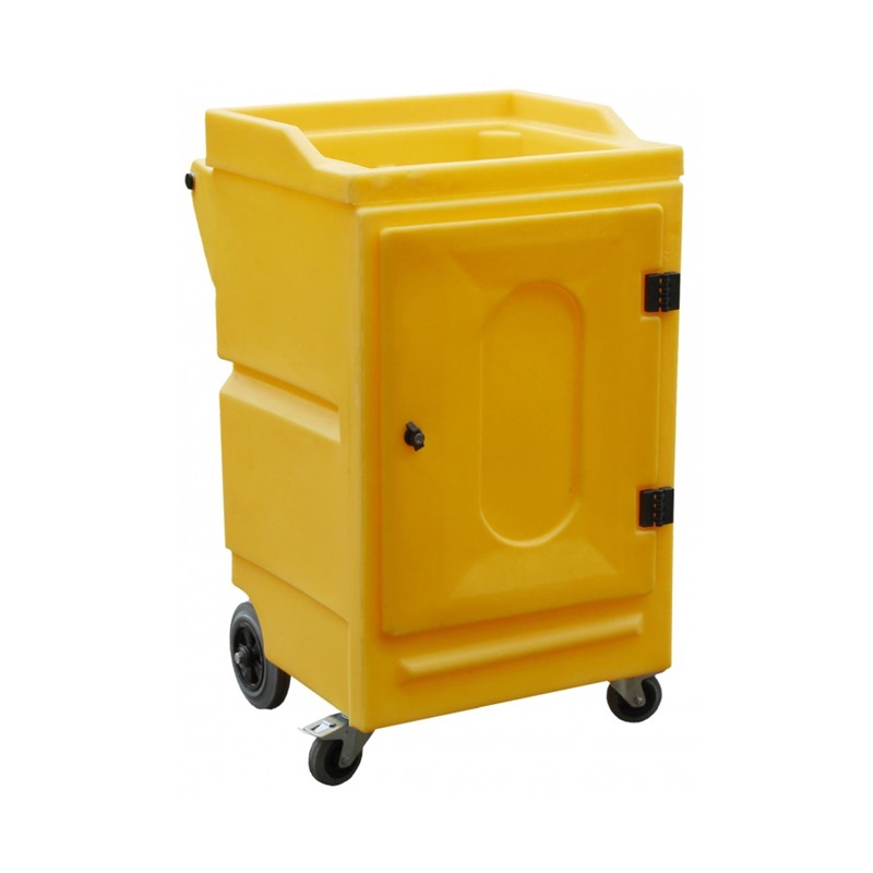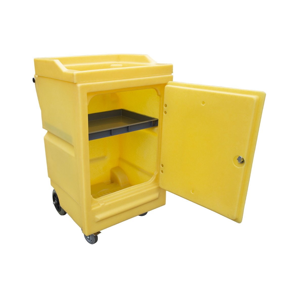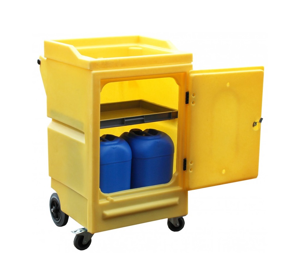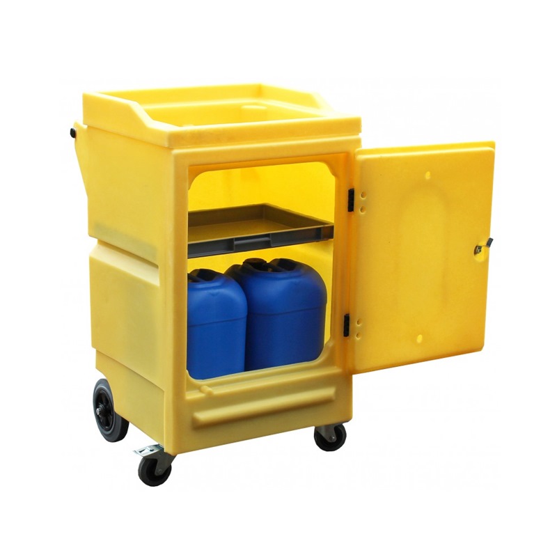 Rotationally moulded from durable polyethylene this fully mobile (two large fixed rear wheels and two front, swivel and lockable castors) cabinet is fitted with a lockable door and comes complete with a height adjustable shelf and a recessed top (18ltr capacity) which can act as a temporary spill tray if a container of liquid becomes compromised.
