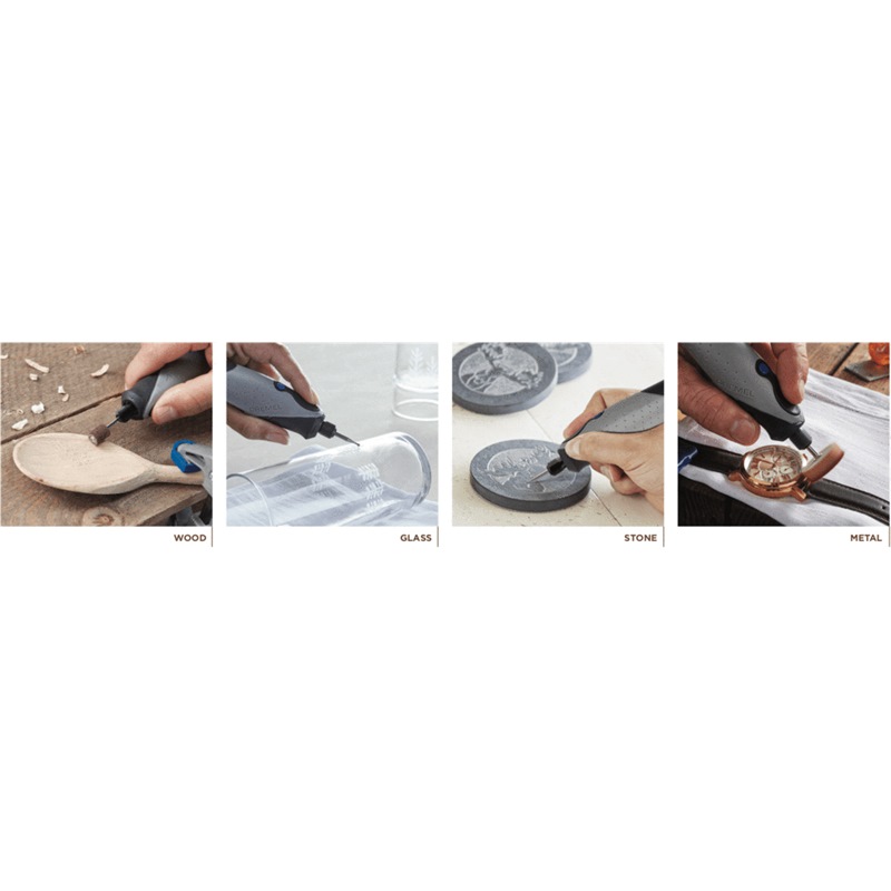 The tool variable speed ranges from 5,000 to 22,000 RPM, providing the optimal speed control for applications such as glass etching, leather burnishing, bead making, wood engraving and more.