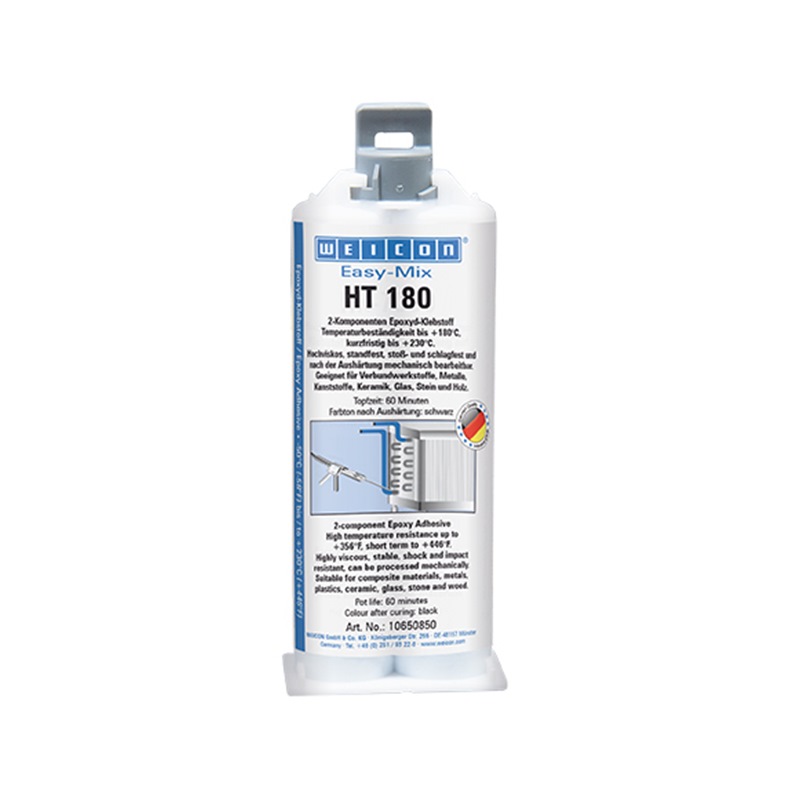 WEICON Easy-Mix HT 180 is a 2-component adhesive on epoxy resin basis and has a high temperature resistance of up to +180°C; short term to +230°C.