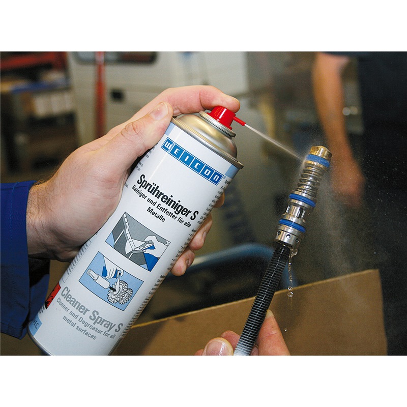 WEICON Cleaner Spray S can be used for cleaning and degreasing before priming and painting, for cleaning machine parts or before other WEICON products are applied on surfaces where a greasy underground would impair their effect.