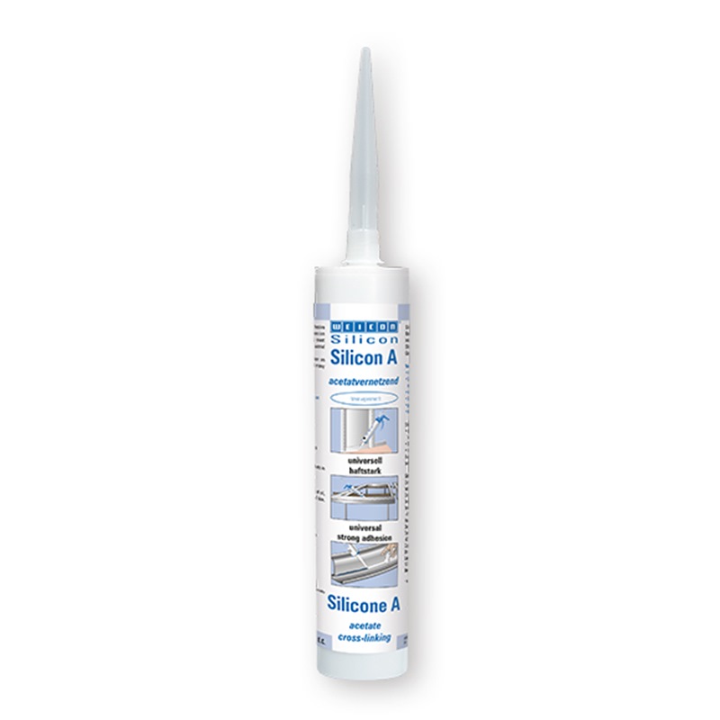 WEICON Silicone A adhesive and sealant contains no solvents, has acetate-crosslinking properties, is strong, permanently elastic, resistant to ageing and chemicals, temperature resistant up to +180°C (+356°F), extremely elastic (breaking elongation >700%) and can be used universally.