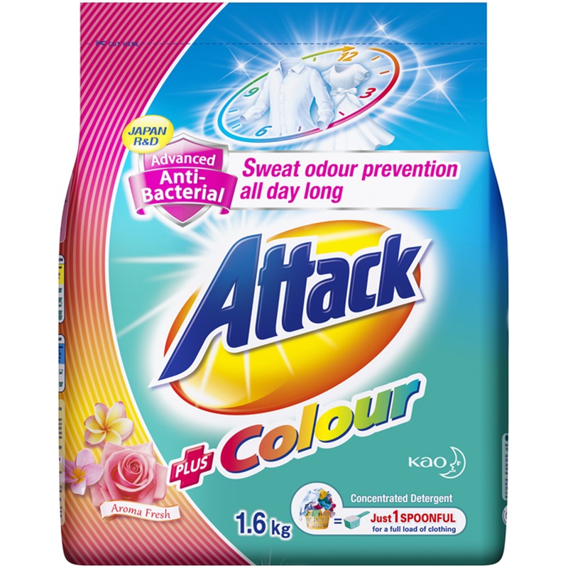 New & improved Attack Powder Colour Advanced Anti-bacterial laundry detergent effectively removes stains and bacteria during wash and also inhibits bacteria growth on your clothes with just 1 spoonful.
