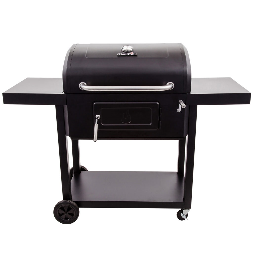 Other features include a charcoal pan designed to reduce flare-ups, convenient side shelves, and a front-facing charcoal access door which allows the user to tend to your coals without having to remove the cooking grates or food.