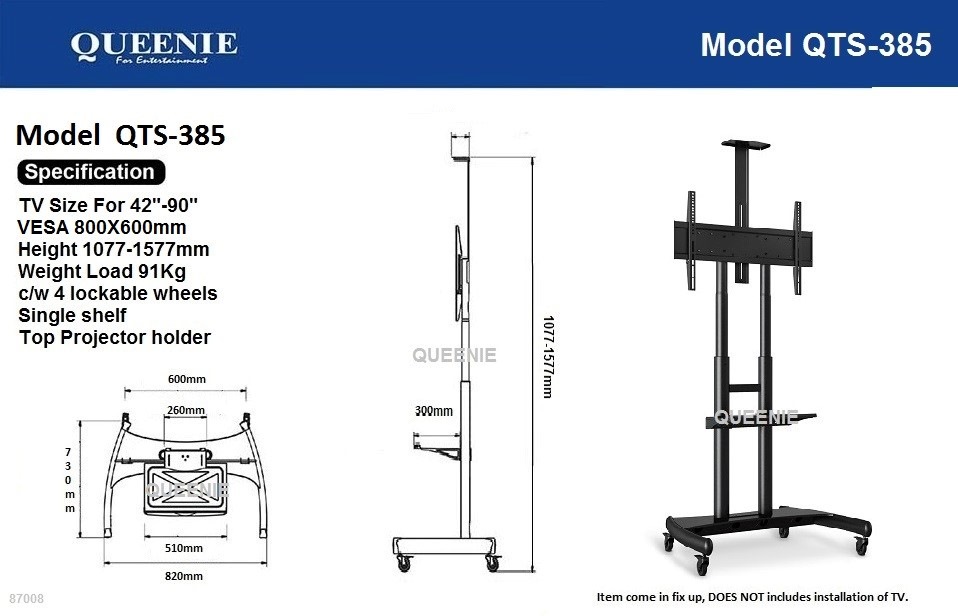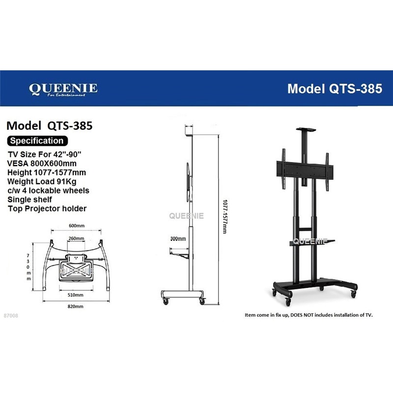 Home » Household Products » TV Mounts & TV Stands » QUEENIE QTS-385 TROLLEY STAND SINGLE METAL SHELF 42" - 90" FIXED 91KG