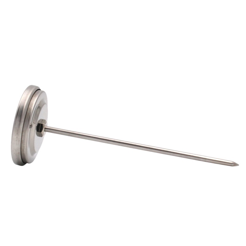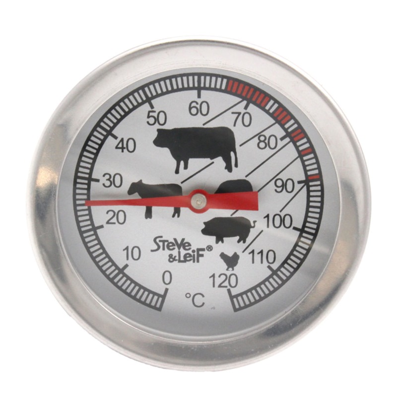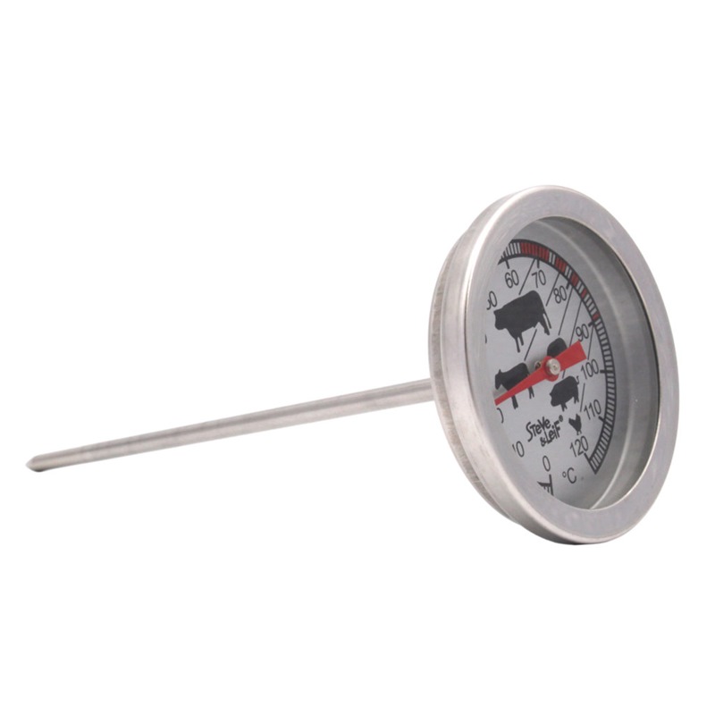 Stainless steel meat thermometer with large, easy-to-read dial ranging from 0°C to 120°C.