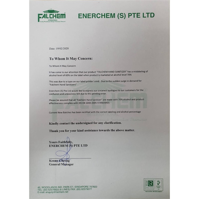 *Note: There is a mislabeling of alcohol level of 60% for the first few batch that is produced before 19/2/20, the actual product's alcohol level is 70% as marketed (Image 2).
