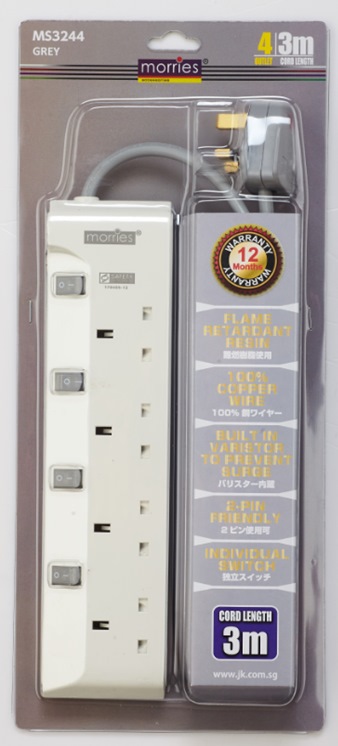 Home » Electrical & Lighting » Extension Cords & Travel Adaptors » MORRIES MS 3244G (GREY) 4WAY EXTENSION CORD 3M W/ SURGE PROTECTOR