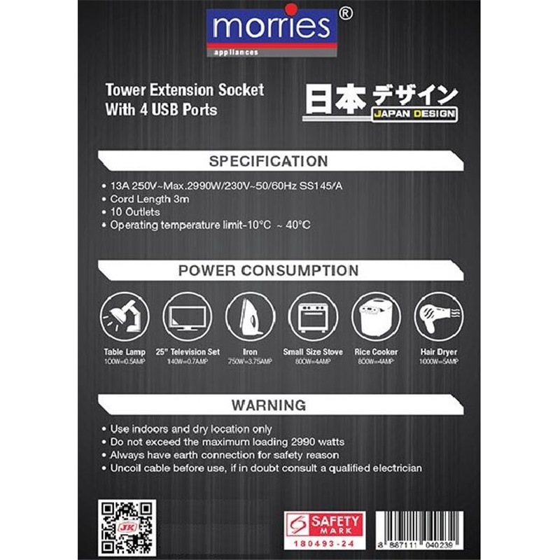 MORRIES MS104TUSB TOWER EXTENSION SOCKET W/ 4 USB PORTS MS104TUSB