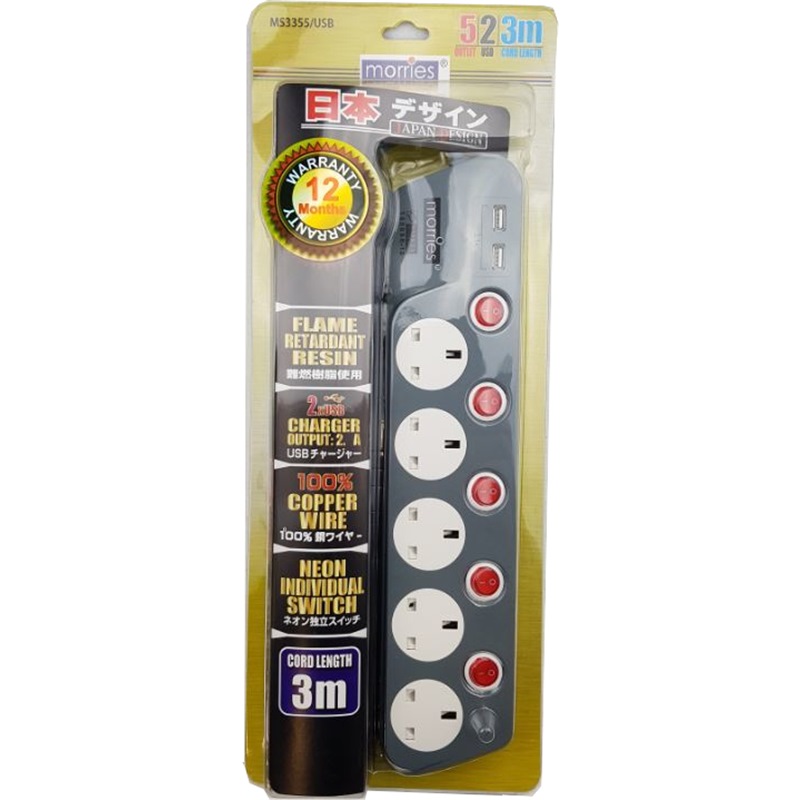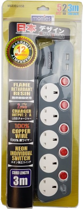 MORRIES 3M EXTENSION CORD 4W W/2USB PORTS-MS3344N4-3M/USB2.1