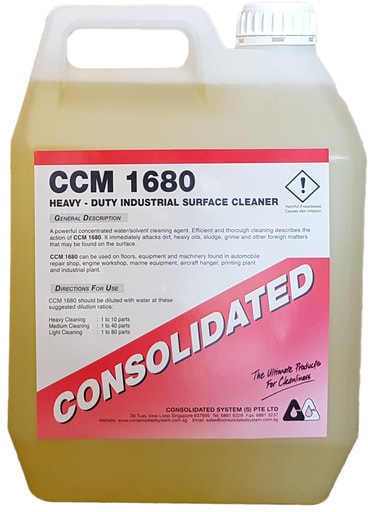 CCM 1680 can be used to remove grimy industrial surfaces, floors, equipment and machinery found in automobile repair shop, engine work shop, marine equipment, aircraft hanger, printing plant and industrial plant.