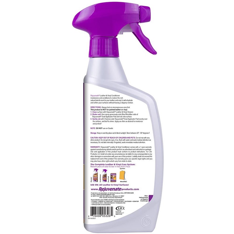 Rejuvenate Leather & Vinyl Conditioner instantly rehydrates, restores and protects all your leather and vinyl surfaces with one easy spray on application. To use this cleaning solution, simply clean the area first with our Rejuvenate Leather & Vinyl Cleaner. Next, apply this non-greasy conditioner as directed using a microfiber towel or one of our Rejuvenate Chamois and Microfiber Polishing Pad and buff to a shine. Our leather conditioner and vinyl conditioner formula rehydrate’s your leather couch, leather coat and vinyl items to reveal the beauty and make it new again.