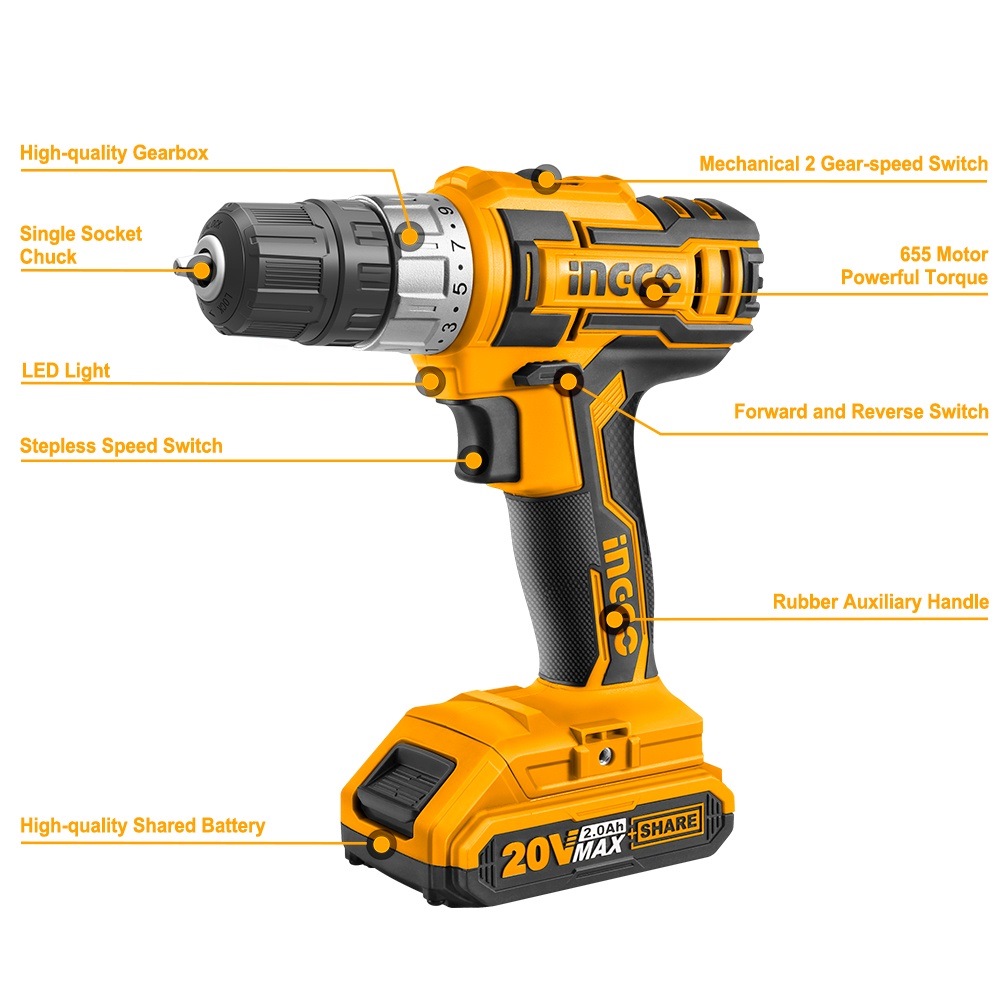 Home » Power Tools - Cordless » Cordless Drills, Impact Drivers & Wrenches » INGCO 20V LI-ION DRILL 45NM 1X20V 2.0AH, CHARGER CDLI20024