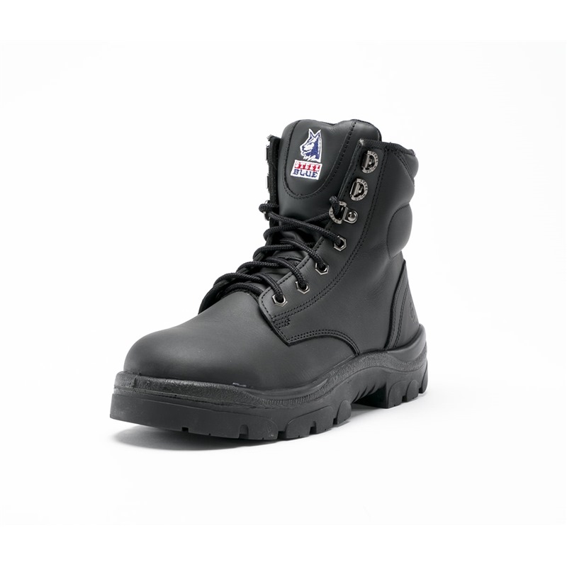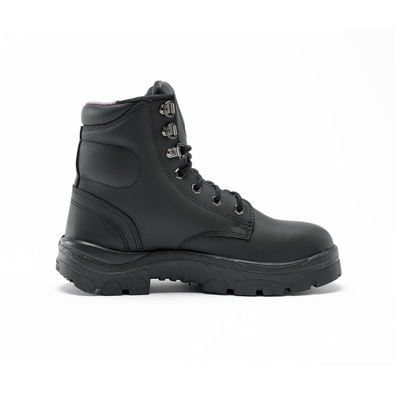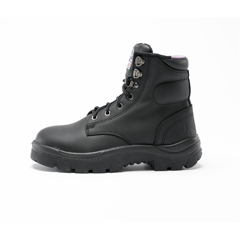 The Argyle® Ladies is a 140mm derby style, lace-up ladies Ankle Boot with padded collar and tongue. A popular 100% comfortable choice for Mining, Construction and Road Workers with a TPU outsole heat resistant to 130 degrees and a 200 joule safety steel toecap. The Argyle® Ladies has anti-static properties and premium water resistant leather available in black and wheat nubuck.