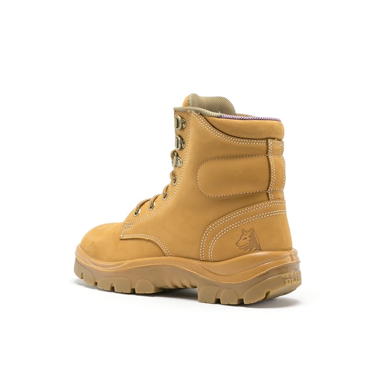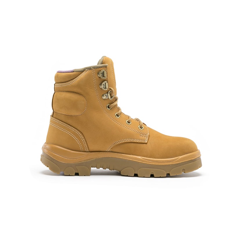 The Argyle® Ladies is a 140mm derby style, lace-up ladies Ankle Boot with padded collar and tongue. A popular 100% comfortable choice for Mining, Construction and Road Workers with a TPU outsole heat resistant to 130 degrees and a 200 joule safety steel toecap. The Argyle® Ladies has anti-static properties and premium water resistant leather available in black and wheat nubuck.
