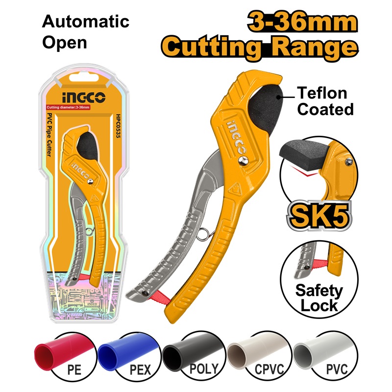 Home » Hand Tools » Plumbing Tools » INGCO INDUSTRIAL PVC PIPE CUTTER CAP: 36MM, LENGTH 210MM HPCS3135