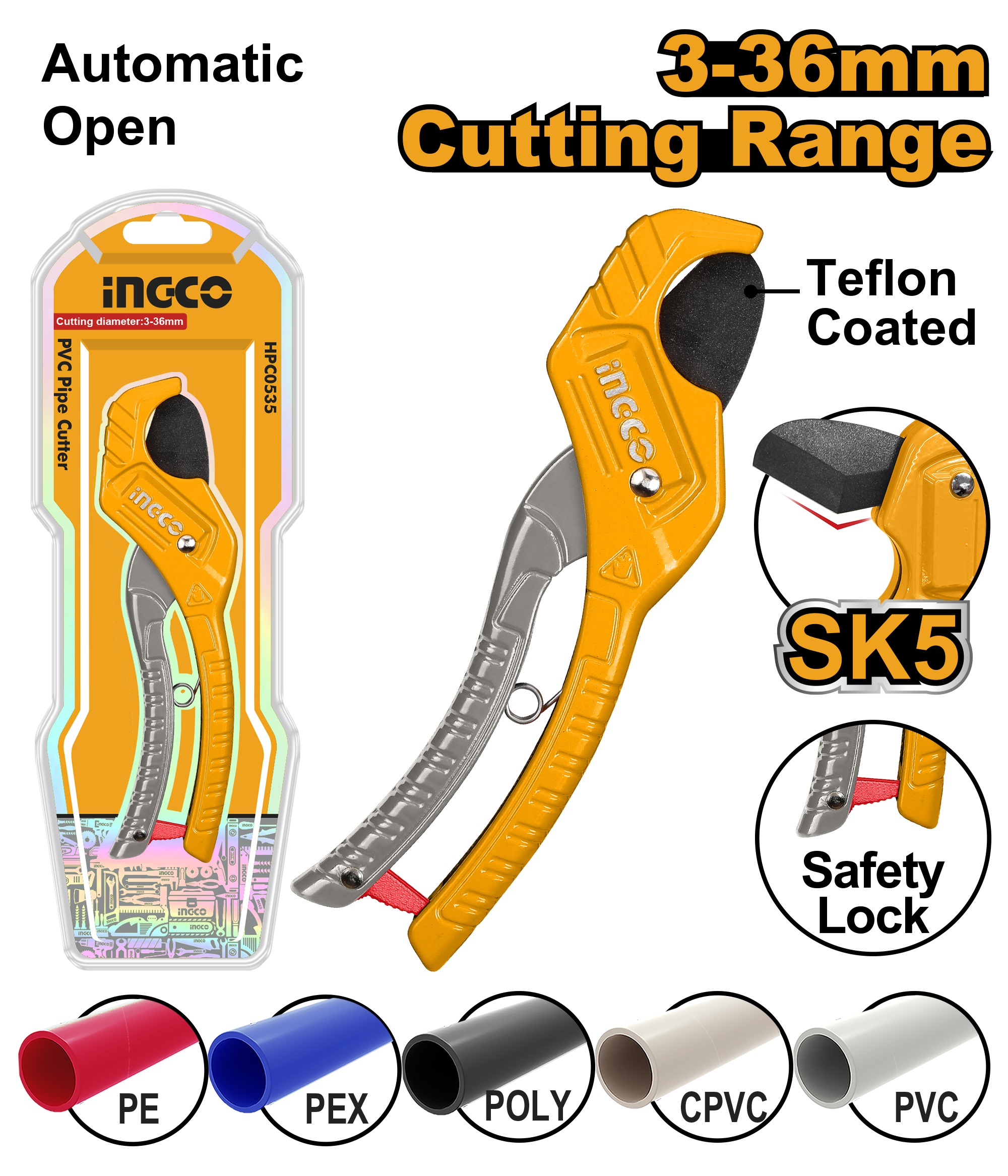 INGCO INDUSTRIAL PVC PIPE CUTTER CAP: 36MM, LENGTH 210MM HPCS3135