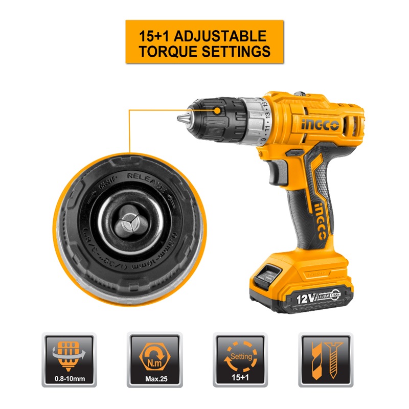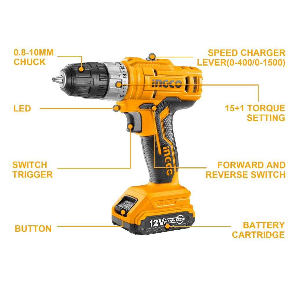 INGCO 12V 2X1.5AH LI-ION DRILL, CDLI1222