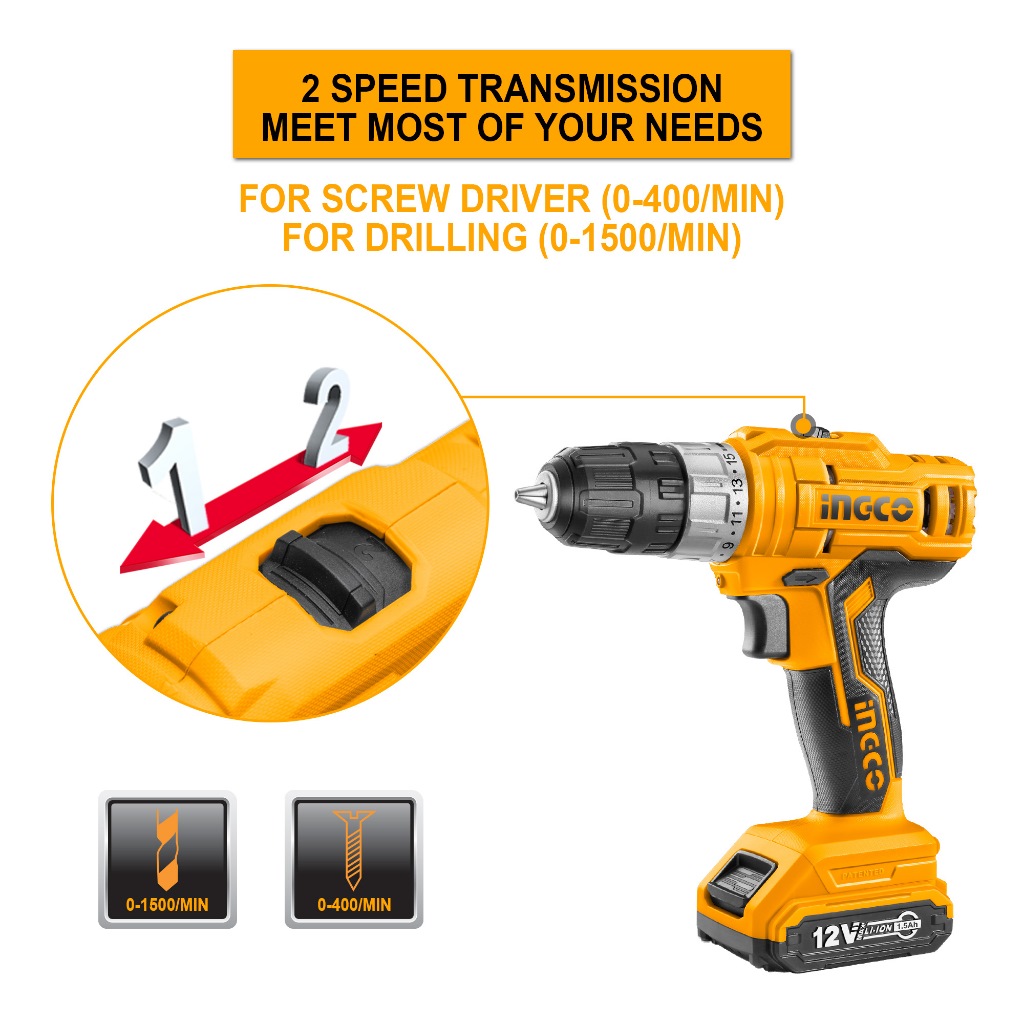Home » Power Tools - Cordless » Cordless Drills, Impact Drivers & Wrenches » INGCO 12V 2X1.5AH LI-ION DRILL, CDLI1222