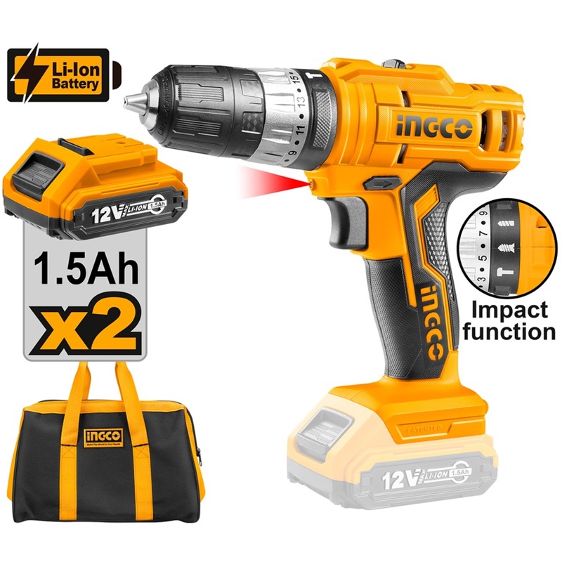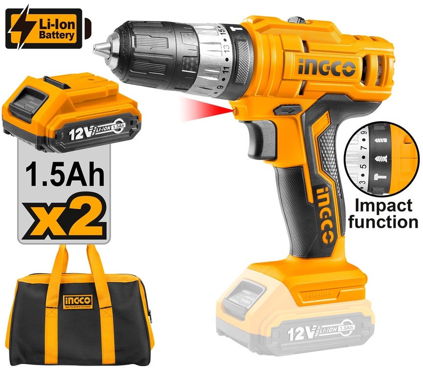 INGCO 12V 2X1.5AH LI-ION IMPACT DRILL, CIDLI1222