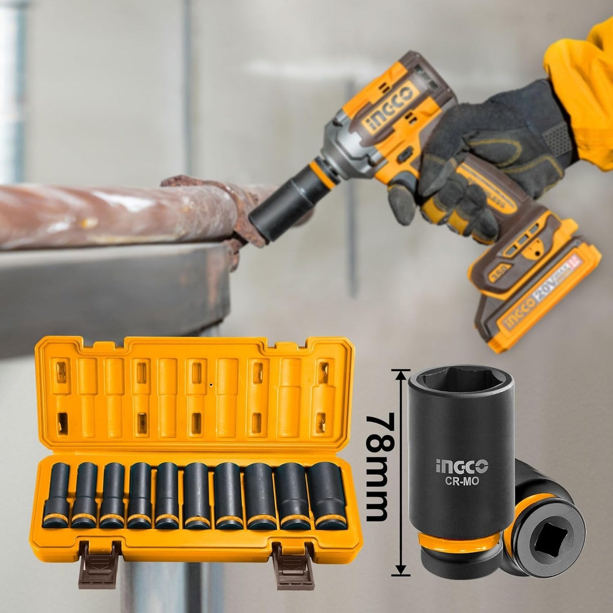 INGCO 10PCS 1/2" DR. CR-MO DEEP MPACT SOCKET SET 10-24MM HKISSD12102L