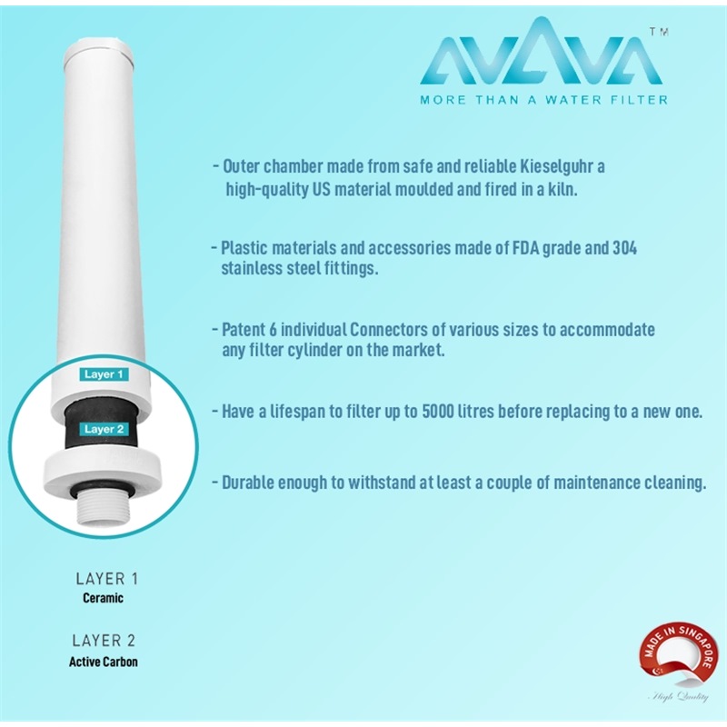 AVAVA Ceramic Filtration Cylinder comprises of an outer chamber made from safe and reliable Kieselguhr a high-quality US material moulded and fired in a kiln.