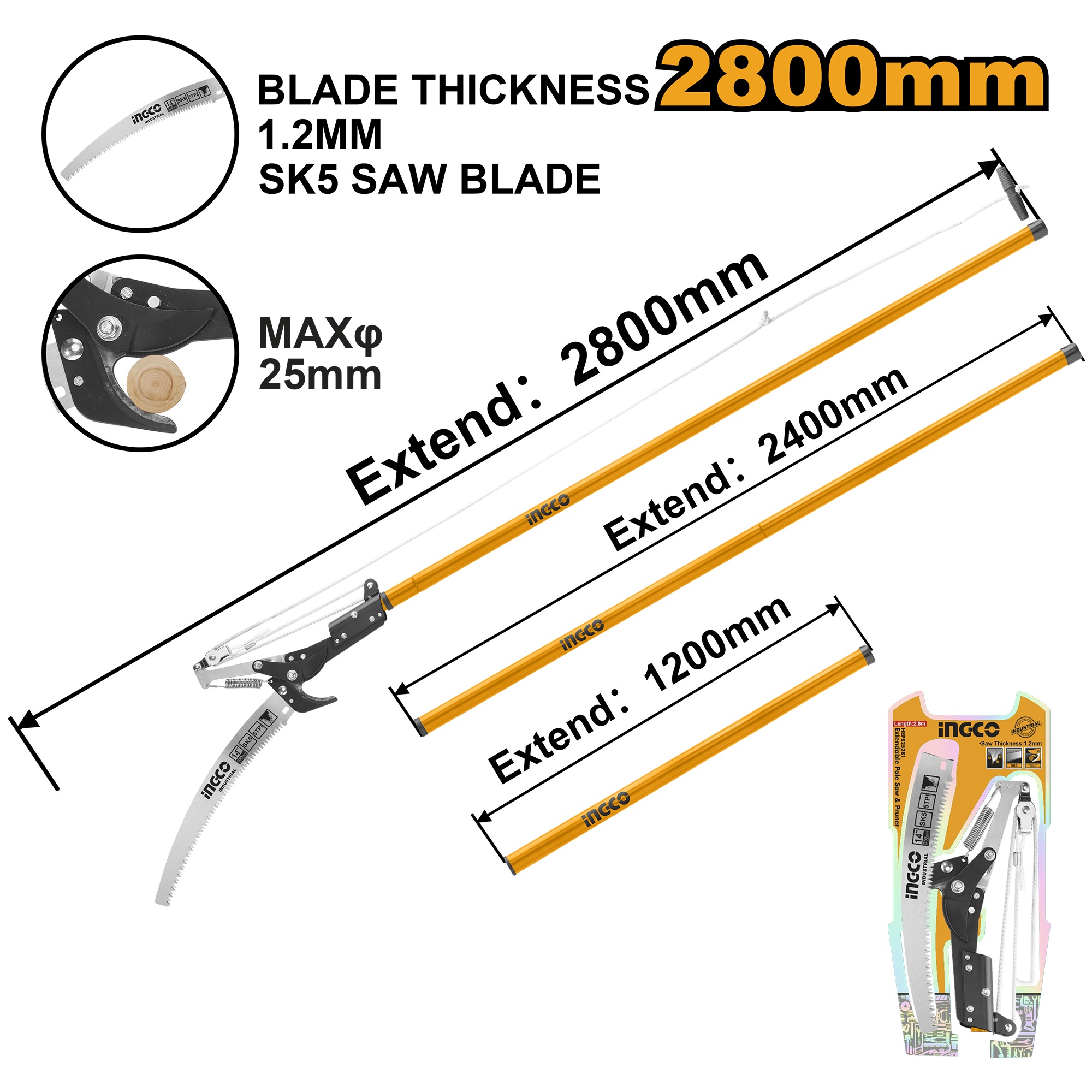 INGCO EXTENDABLE PRUNING CUTTER & POLE SAW MAX. HEIGHT 2.80M HEPS25281