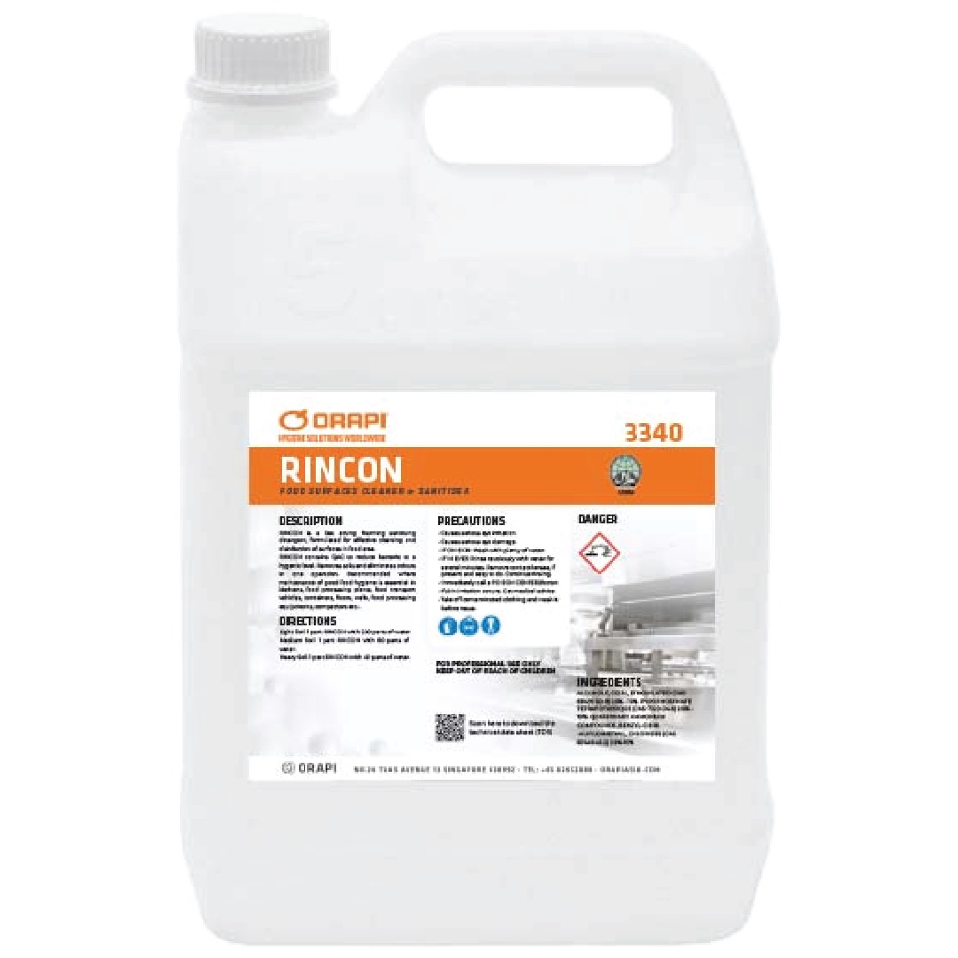 Home » Cleaning Supplies » Halal Certified Cleaning Chemicals » ORAPI RINCON FOOD SAFE SURFACES CLEANER & SANITISER 5L OH-3340-J1 [HALAL]