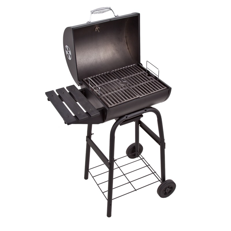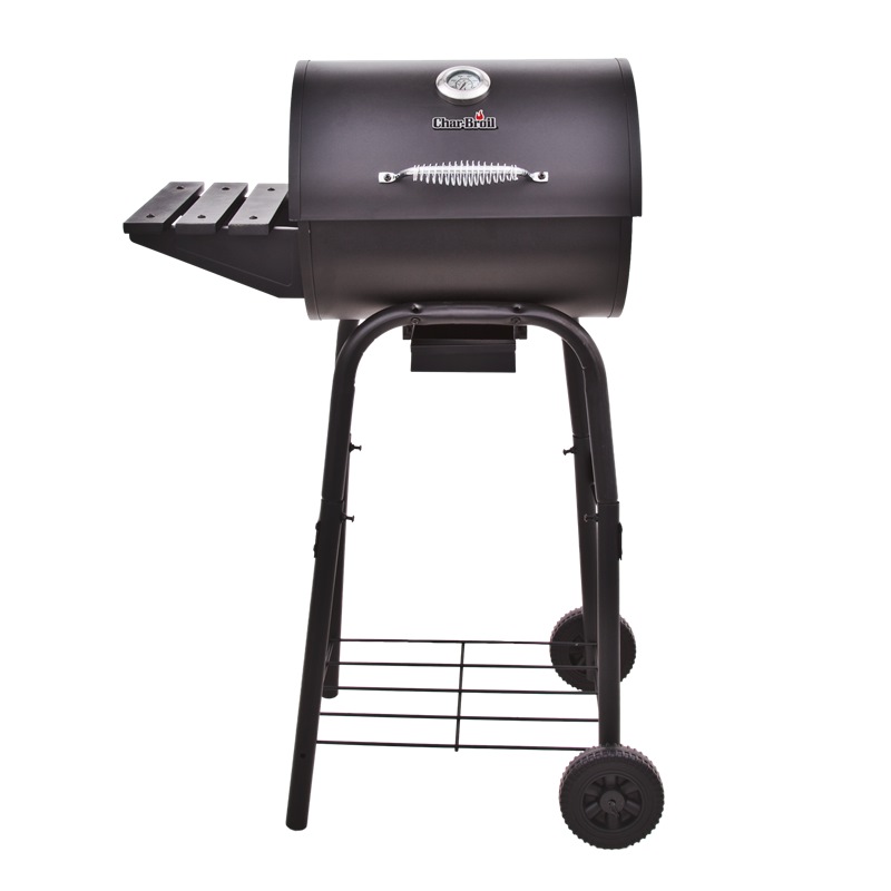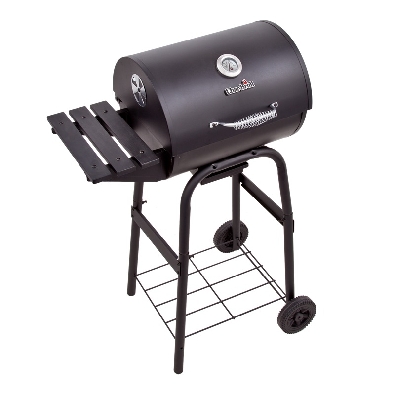 Charcoal grillers will love the Char-Broil small barrel grill. This durable grill features adjustable fire grates and dampers, as well as a removable ash pan. The grates are cast iron, which are great for searing. It also has a swing-a-way warming rack, temperature gauge and a handy side shelf. Move the grill easily with rolling casters.