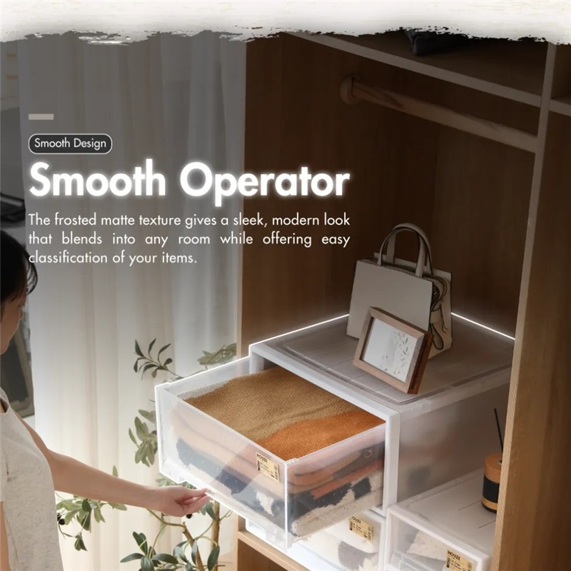 The transparent drawer front lets you see your belongings at a glance, while the frosted white frame keeps things stylish and minimal.
