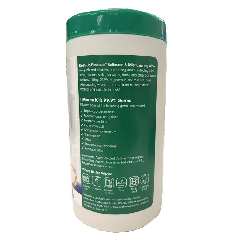 Kleen-Up Flushable Bathroom & Toilet Cleaning Wipes are made from hydro-entangled nonwoven which are water-dispersable.