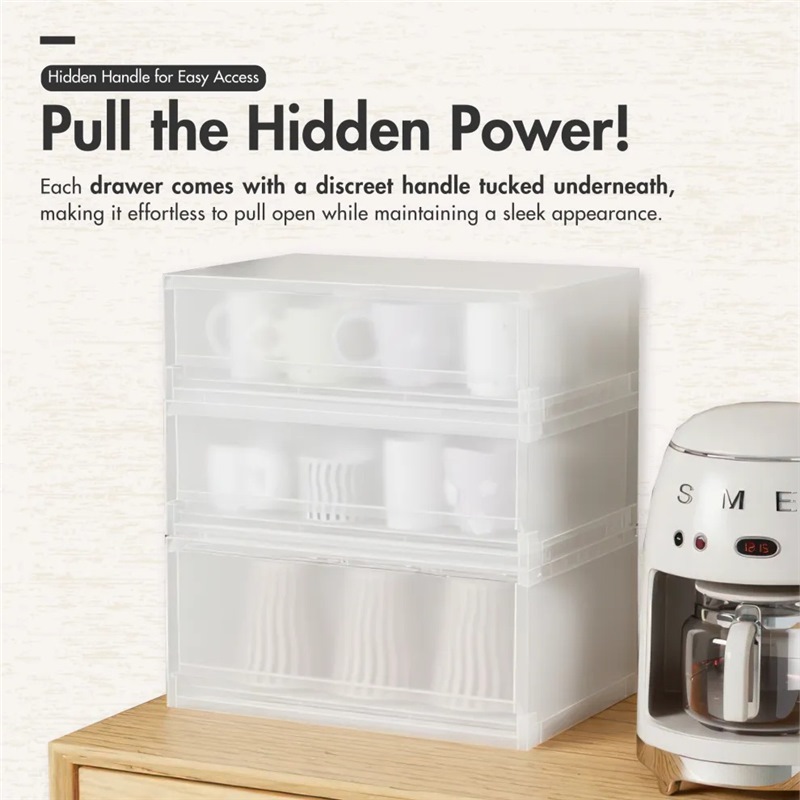 Each drawer comes with a discreet handle tucked underneath, making it effortless to pull open while maintaining a sleek appearance.