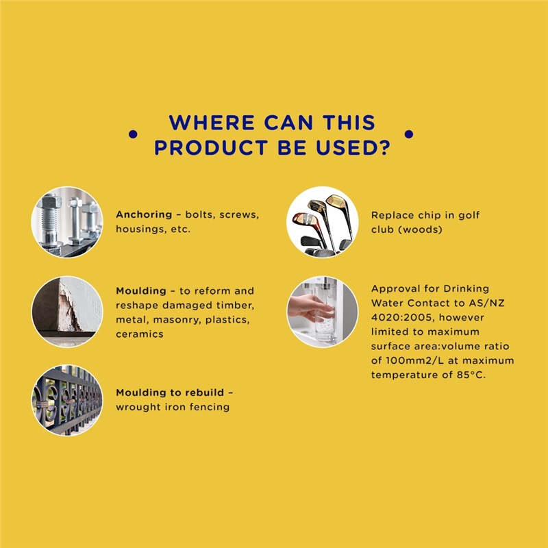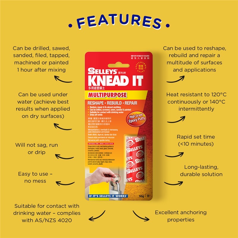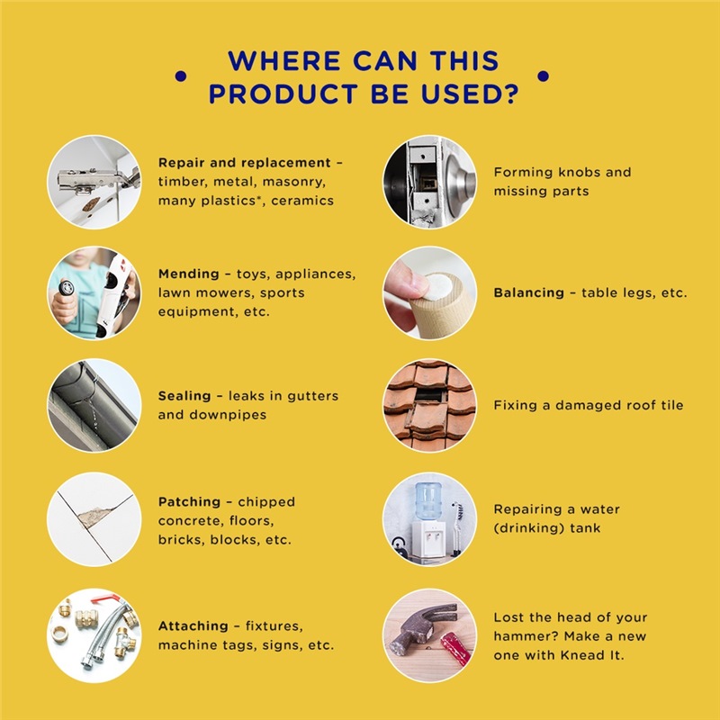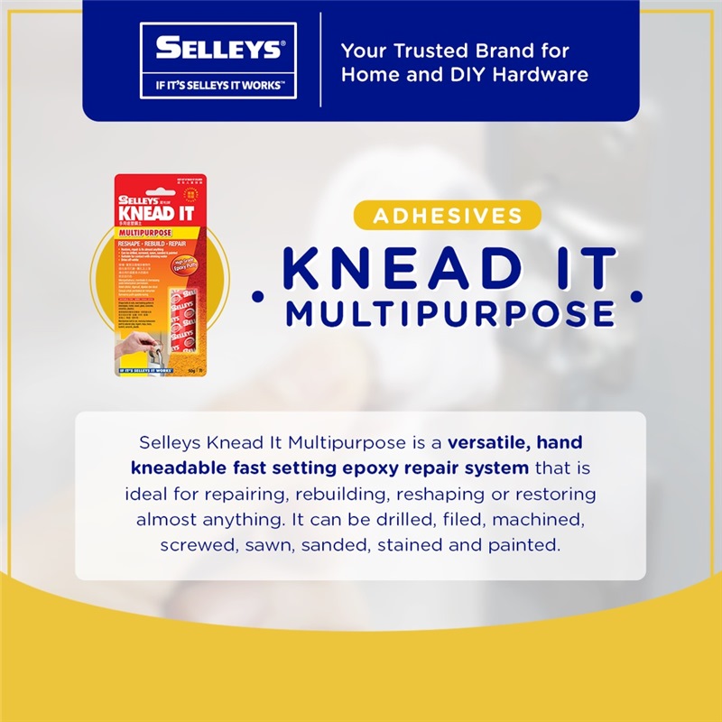 Selleys Knead It Multipurpose is a versatile, hand kneadable fast setting epoxy repair system that is ideal for repairing, rebuilding, reshaping or restoring almost anything. It can be drilled, filed, machined, screwed, sawn, sanded, stained and painted.
