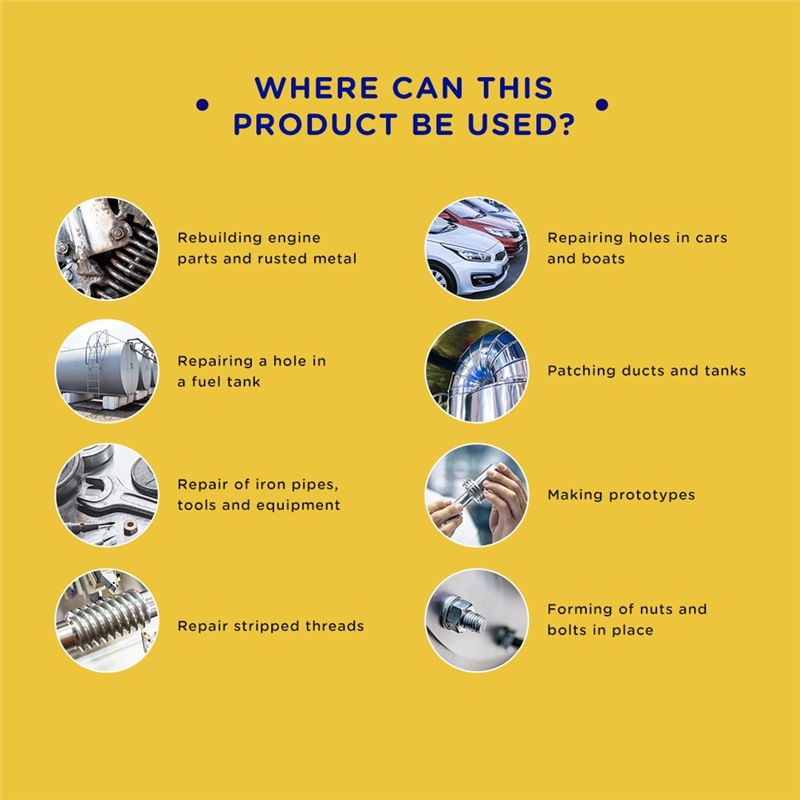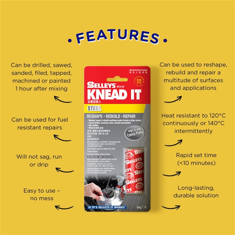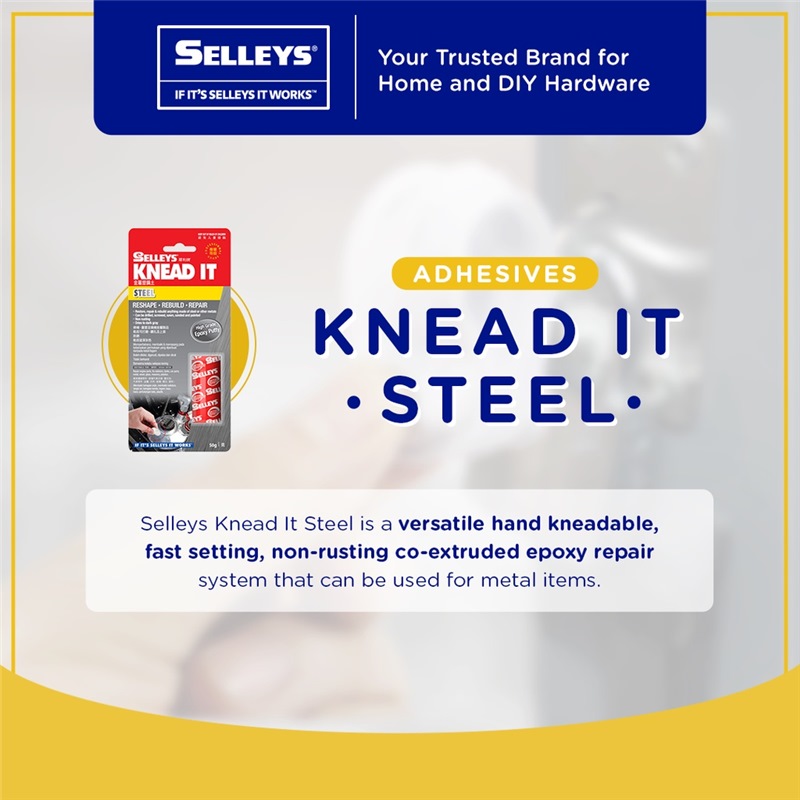 Selleys Knead It Steel is a versatile hand kneadable, fast setting, non-rusting co-extruded epoxy repair system that can be used for metal items.