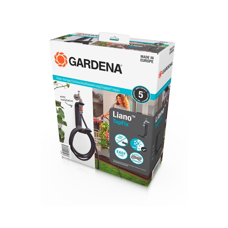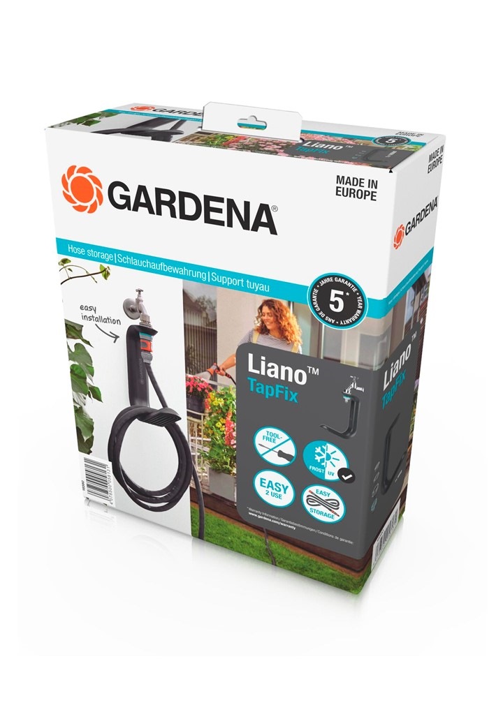The Liano™ TapFix hose storage by GARDENA can be quickly and easily connected to almost any water tap (G 1", G 3/4" and G 1/2") without any drilling or even using tools.
