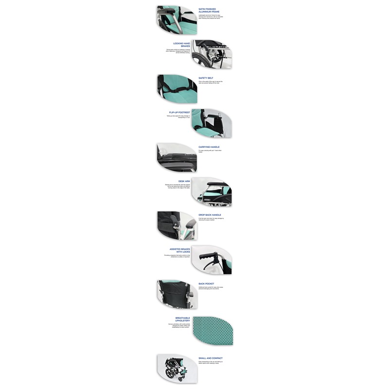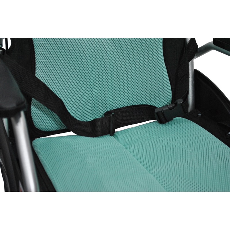 Equipped with a safety belt to prevent the user from falling off, assisted brakes make it convenient for caregivers and foldable backrest for compact storage.