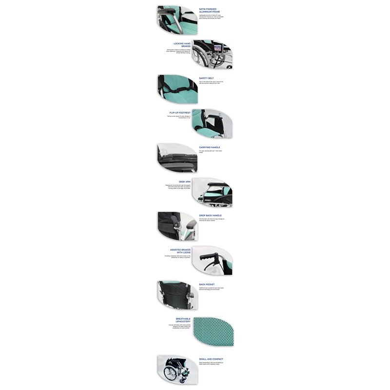 This ASSURE Rehab wheelchair is made from aluminium frame that is lightweight to carry around and resistant to corrosion.