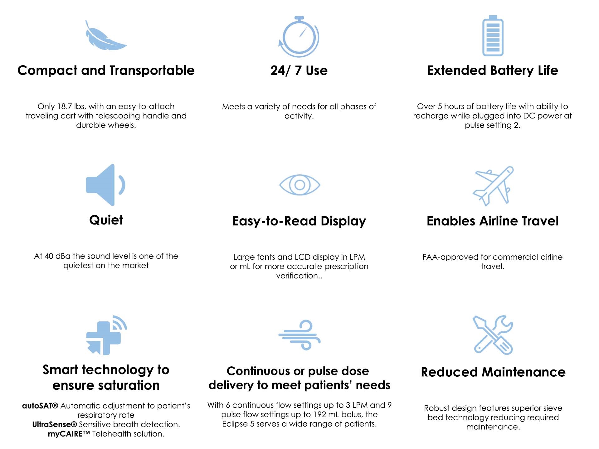 The award-winning Eclipse 5 transportable oxygen concentrator combines continuous and pulse dose flow options in one device, offering greater flexibility for hospital discharges, traveling and everyday portability.