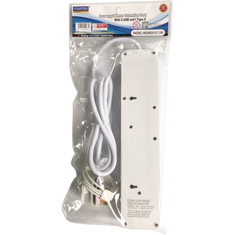 Home » Electrical & Lighting » Extension Cords & Travel Adaptors » MORRIES 4WAY 2M CORD (2USB + 1 TYPE C) MS4W2U1C/2M