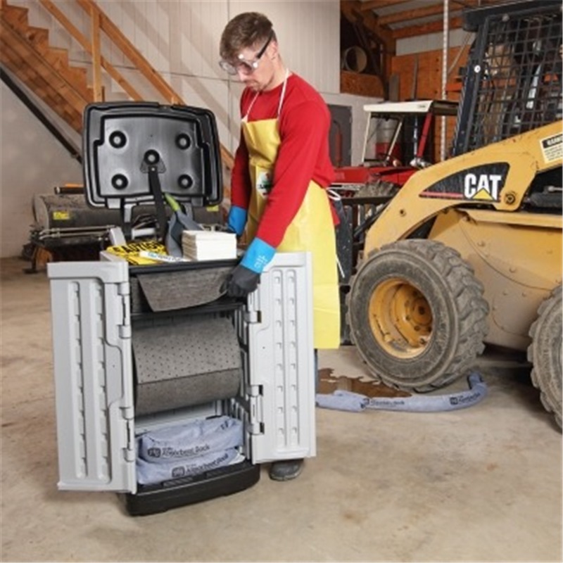 Manage spills of water, coolants, oils, or solvents quickly with this wheel caddy and its pre-packed absorbents, disposal bags, and more; see the Product Specifications tab for a list of products included