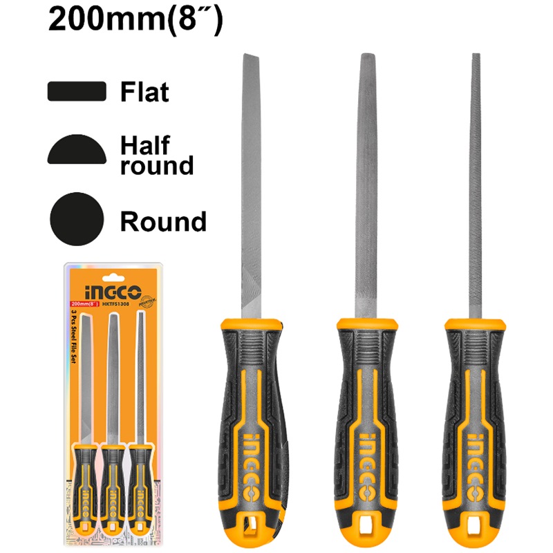INGCO 3PCS STEEL FILE SET-FLAT, HALF ROUND, & ROUND 8" 200MM HKTFS1308