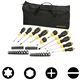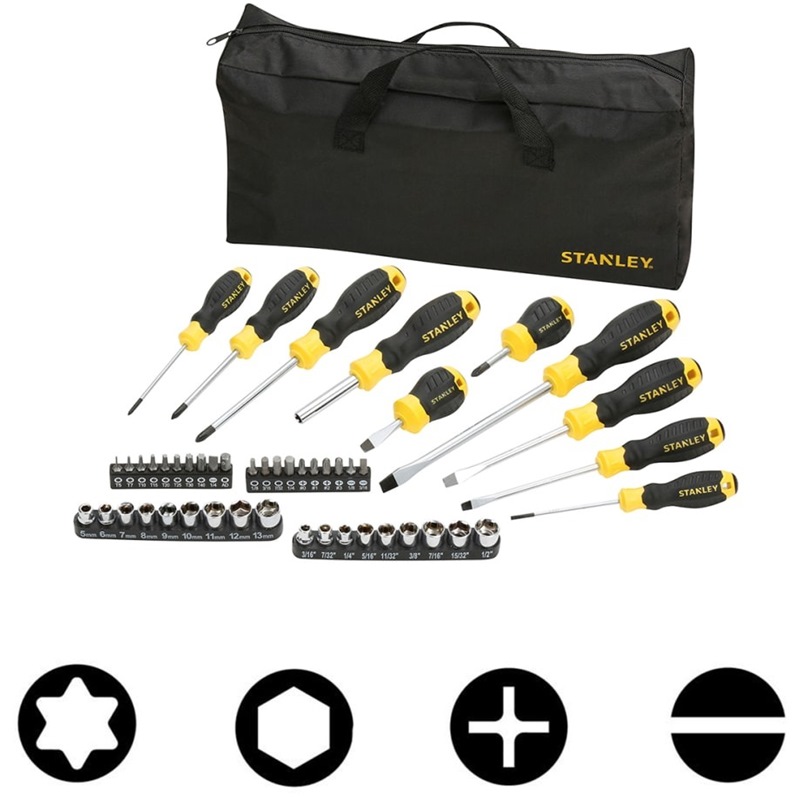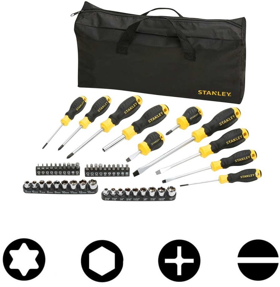The stanley stht0-70887 is the complete screwdriver set including bits and sockets and a bag to store your tools conveniently.