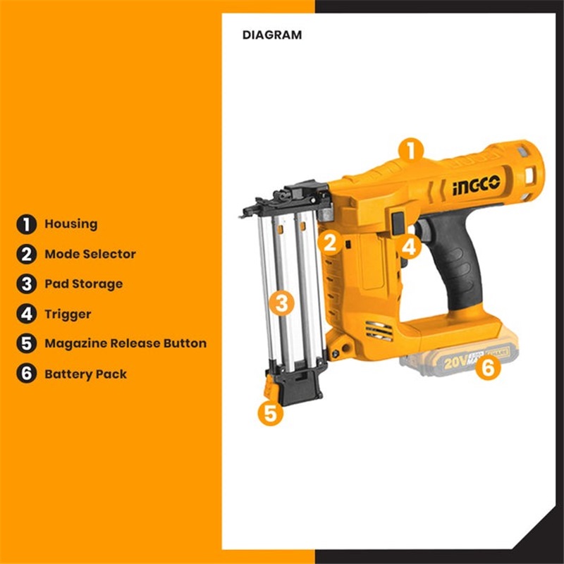 Home » Power Tools - Cordless » Bare Units » INGCO 20V LI-ION CORDLESS BRAD NAILER SIZE F15-F50 CBNLI2028 (BARE UNIT)