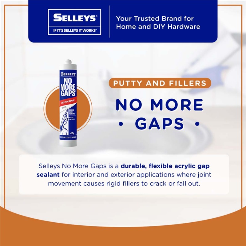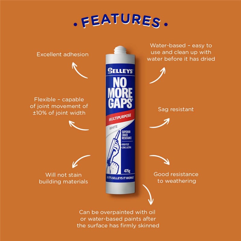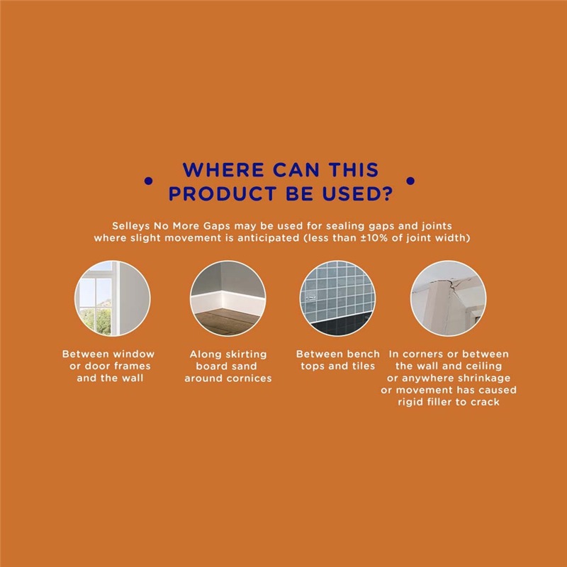 Selleys No More Gaps is a durable, flexible acrylic gap sealant for interior and exterior applications where joint movement causes rigid fillers to crack or fall out.
